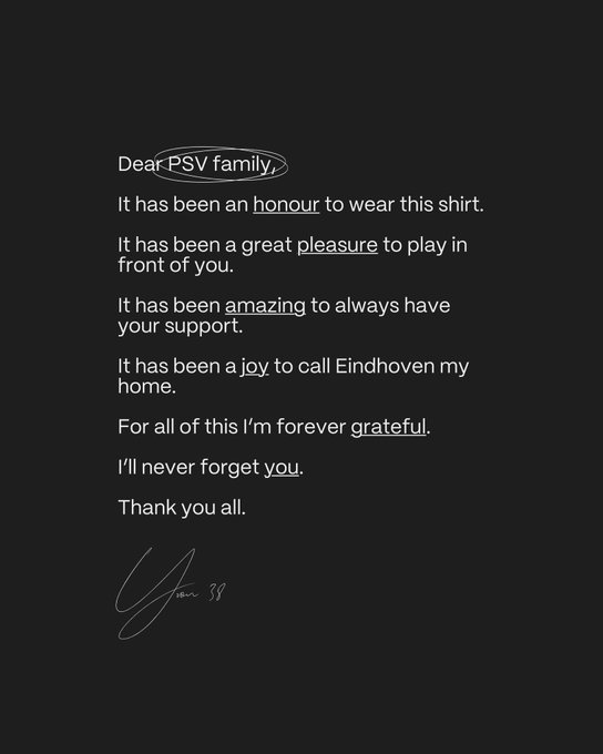 'Het was een eer om dit shirt te dragen en een genot om voor jullie allemaal te spelen', aldus Mvogo. 'Het was geweldig om altijd jullie steun te krijgen en om Eindhoven mijn thuis te noemen. Hiervoor ben ik voor eeuwig dankbaar. Ik zal jullie nooit vergeten', aldus Yvon Mvogo.
