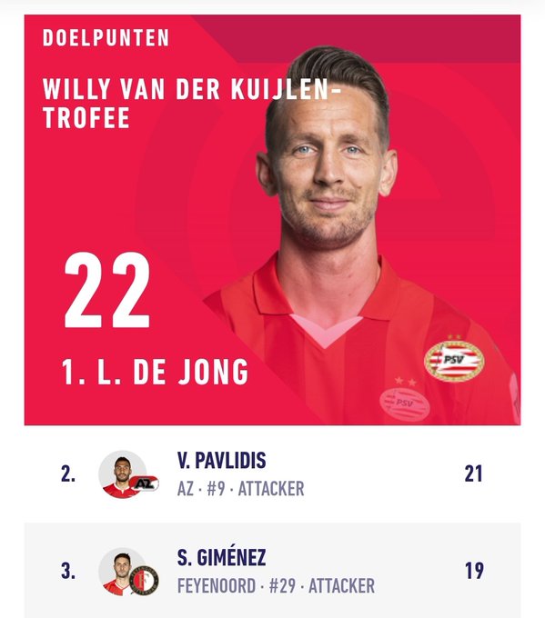 De Jong kwam op 22 competitiegoals, waarmee hij topscorer van de Eredivisie is. De 33-jarige spits is daarnaast de achtste speler in de Eredivisie-historie die in vijf jaargangen twintig competitiedoelpunten maakt. De Jong kent onder voetbalminnend Nederland dan ook nog maar weinig tegenstanders; een ieder is een fan van de spits. Op sociale media wordt de spits bewierwookt, getuige onderstaande berichtgevingen op X.