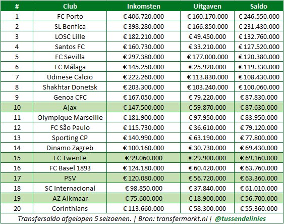 Het voetbalmagazine Tussen de Linie's plaatste een opvallende statistiek over de transferinkomsten van de Nederlandse club maar ook over de transferuitgaven.