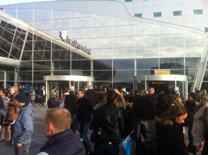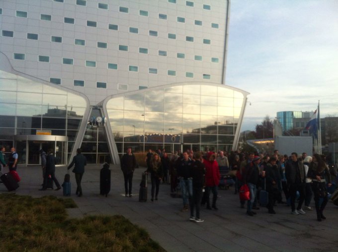 Beelden van de situatie op Eindhoven Airport, dat ontruimd is vanwege waarschijnlijk een verdachte, onbeheerde tas.