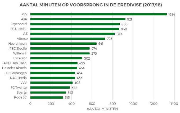 Ja, op PSV lijkt dit seizoen echt geen maat te staan. Het aantal minuten op voorsprong dit seizoen in de eredivisie: