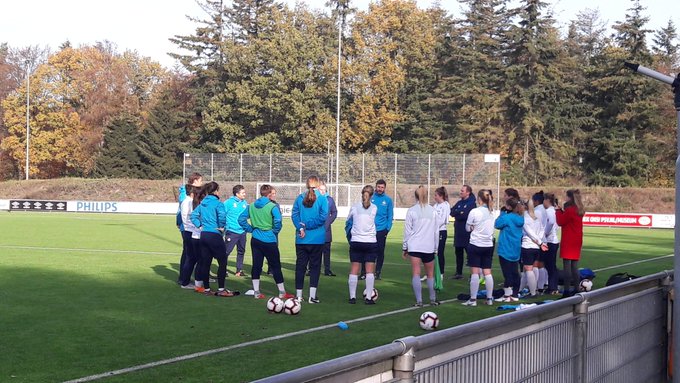 Mark van Bommel motiveert de voetbalvrouwen van PSV aan het eind van de training voor het duel met Ajax. #vrouwenvoetbal